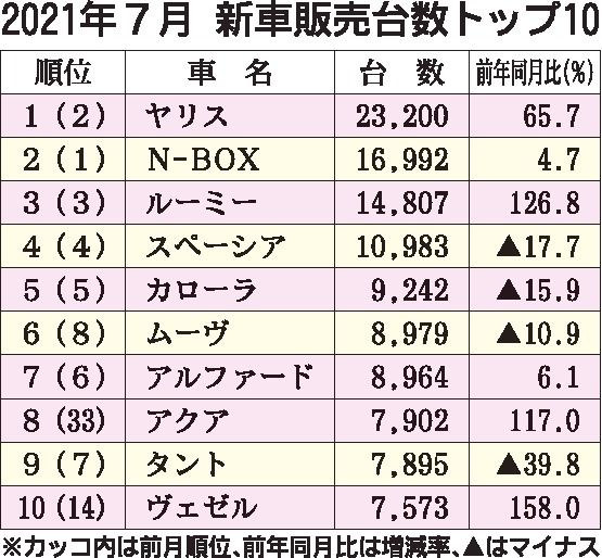 7月の車名別新車販売台数は、トヨタ自動車「ヤリス」が2カ月ぶりのトップに立った。6月に10カ月ぶりの首位だったホンダの軽スーパーハイトワゴン「N―BOX(エヌボックス)」は2位。トップ10のうち軽自動車は4車種にとどまるなど、半導体不足による新車供給遅れの影響が登録車よりも目立つ結果となった。