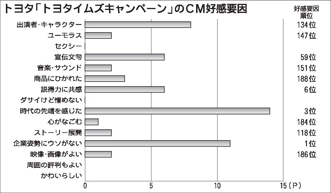 水素エンジンの開発という同社の先進的な取り組みを強く印象づけ、50歳代や20歳代の男性層から多数得票した。CM好感要因の「企業姿勢にウソがない」では総合1位(全2575銘柄)、「時代の先端を感じた」では総合3位をマークした。