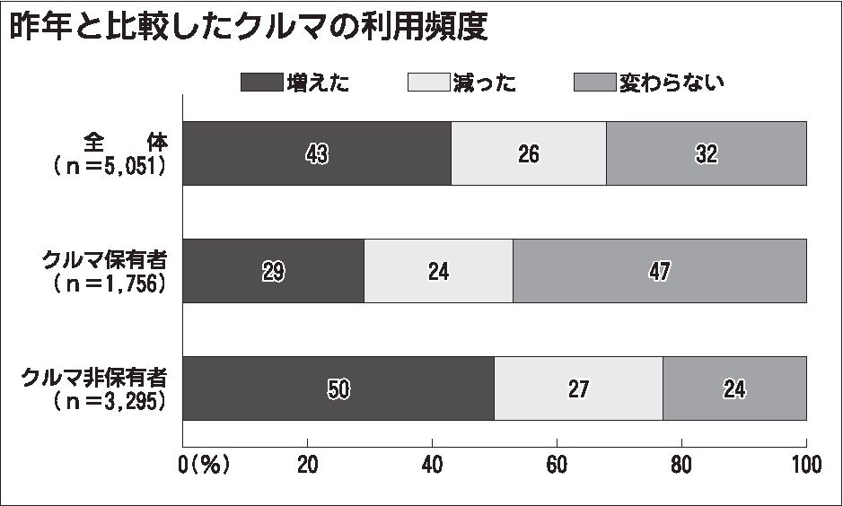 アンケートは「コロナ禍における車の利用状況」を調べる目的で、同社の駐車場やレンタカー、カーシェアリングを利用したタイムズクラブ会員を対象に実施した。9月1~7日にインターネットによって非公開で行い、回答数は自動車の所有者1756人、非所有者3295人の計5051人。