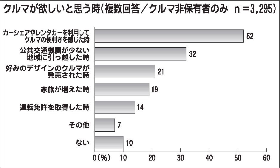 非所有者を対象にした調査では、カーシェアやレンタカーが所有意欲を高めることが証明された。52%がこの2つのサービスを利用して便利さを感じたときに欲しくなると答えており、車の購入を検討している人に限ると64%に上る。また購入予定がない人でも46%がカーシェアやレンタカーを利用した時に欲しいと思うと回答している。