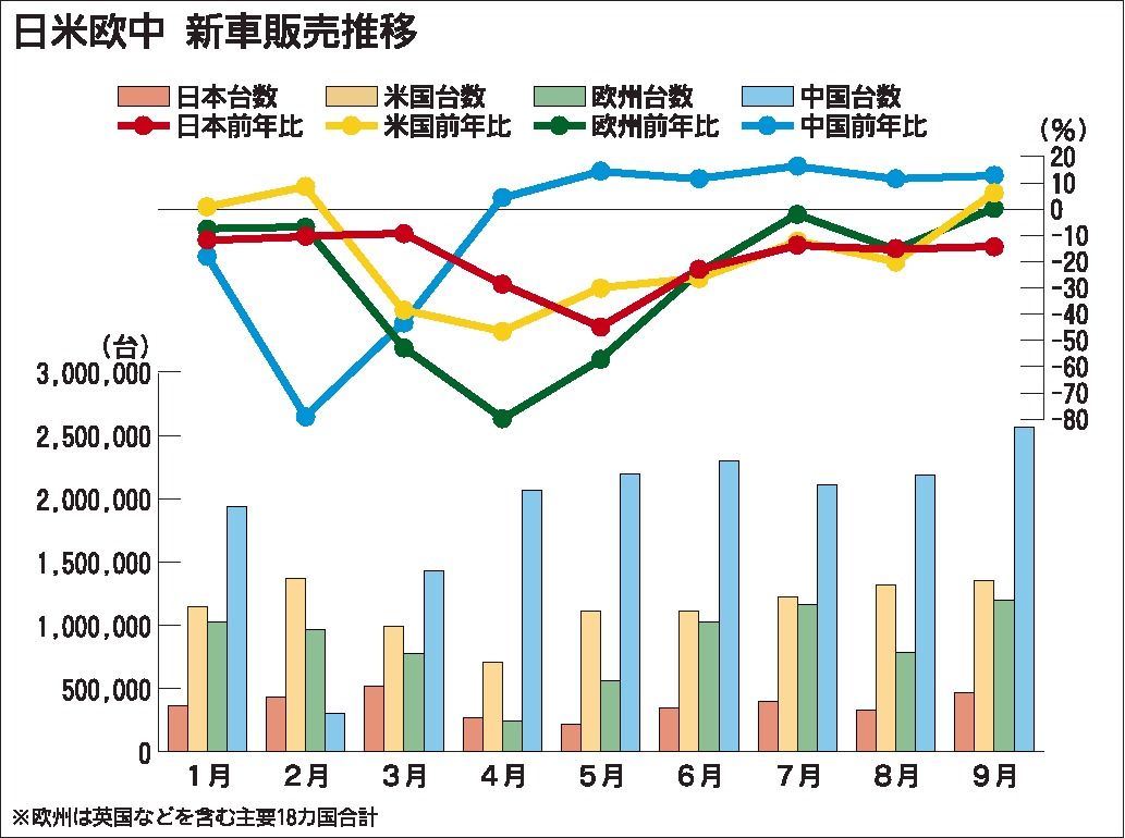 新型コロナウイルスの影響で低迷した世界の主要市場の新車販売が、前年実績を上回る水準まで回復している。いち早く市場が持ち直した中国に続き、米国と欧州が9月の販売実績でプラスに転じた。一方、日本では2桁減が続いているが前年が消費税増税前の駆け...