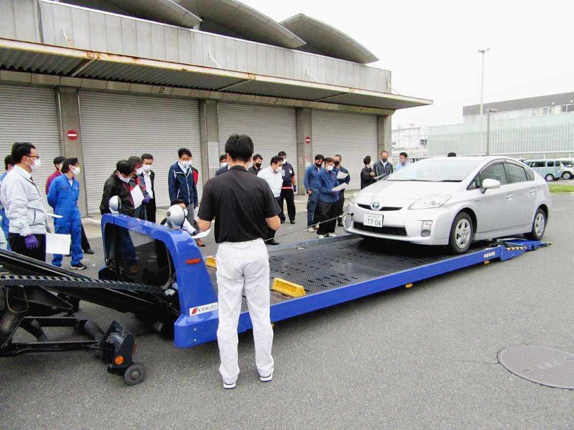 【京都】京都府レンタカー協会(秋山直志会長)は、京都運輸支局(京都市伏見区)構内で、労働安全衛生法等で特別教育受講が義務付けられている積載車巻上げ機(ウィンチ)の運転業務研修会を開いた=写真。日常、回送業務に携わる会員らが参加した。 講師...