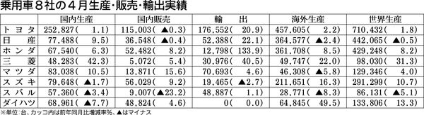 乗用車メーカー8社が30日発表した4月の生産・輸出実績は、中国や米国などの生産増加により、8社合計の世界生産が前年同月比5・0%増の232万357台と3カ月ぶりにプラスに転じた。日産自動車とスバルを除く6社が前年同月を上回り、ホンダ、マツ...