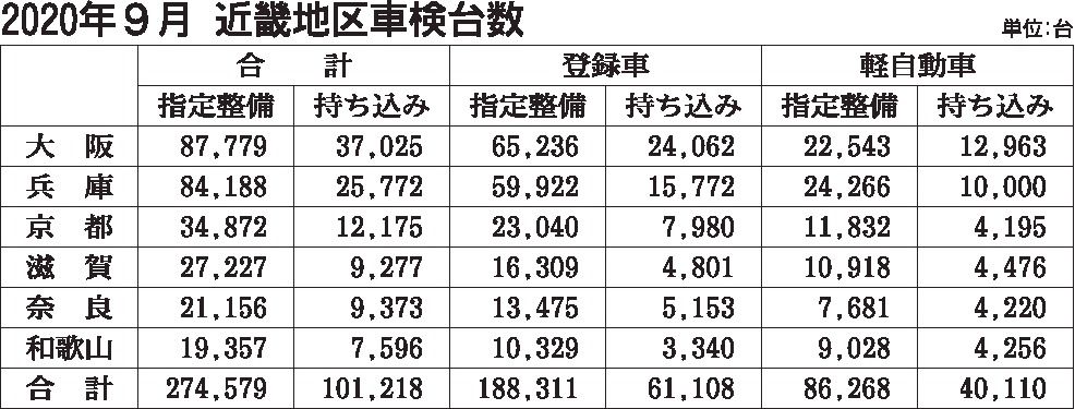 近畿2府4県の2020年9月の継続検査(車検)台数(軽自動車を含む)は前年同月比1・3%増の37万5797台で、3カ月ぶりのプラスだった。登録車は1・2%増の24万9419台、軽も1・7%増の12万6378台で、ともにプラスで推移した。 ...