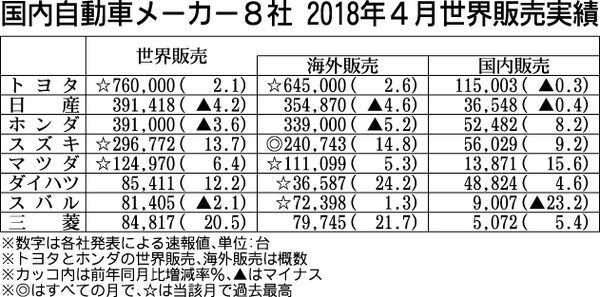 乗用車メーカー8社が30日に発表した2018年4月の世界販売実績(速報値)は、トヨタ自動車、スズキ、マツダの3社が4月としての過去最高を更新した。スズキはインドの販売実績(卸売りベース)と海外販売実績で単月としての過去最高を記録した。 ト...