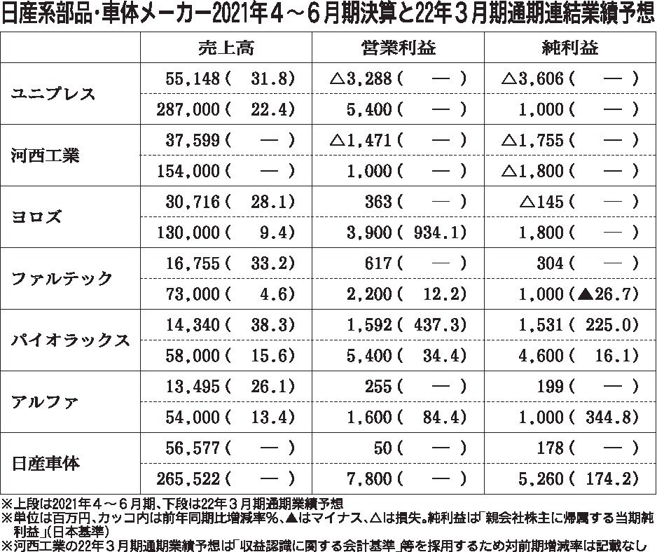 日産系部品メーカー7社の2021年4~6月期決算、自動車生産回復 全社が増収