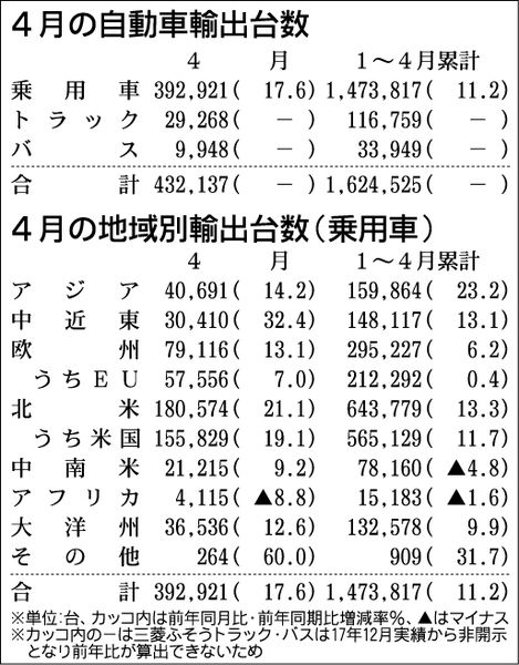 日本自動車工業会が31日まとめた4月の乗用車輸出台数は、前年同月比17・6%増の39万2921台と6カ月連続で増加した。小型車が減少した一方、普通車が6カ月連続で前年同月を上回った。欧州や中南米がプラスに転じ、全地域向けが増加した。 車種...