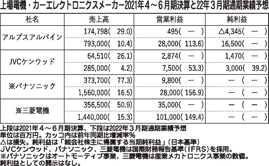 上場している電機・カーエレクトロニクスメーカー4社の2021年4~6月期連結業績は、前年同期が新型コロナウイルス感染拡大の影響があった反動から4社とも増収となった。ただ、車載機器に搭載する半導体不足が影響し、通期業績見通しの収益については...