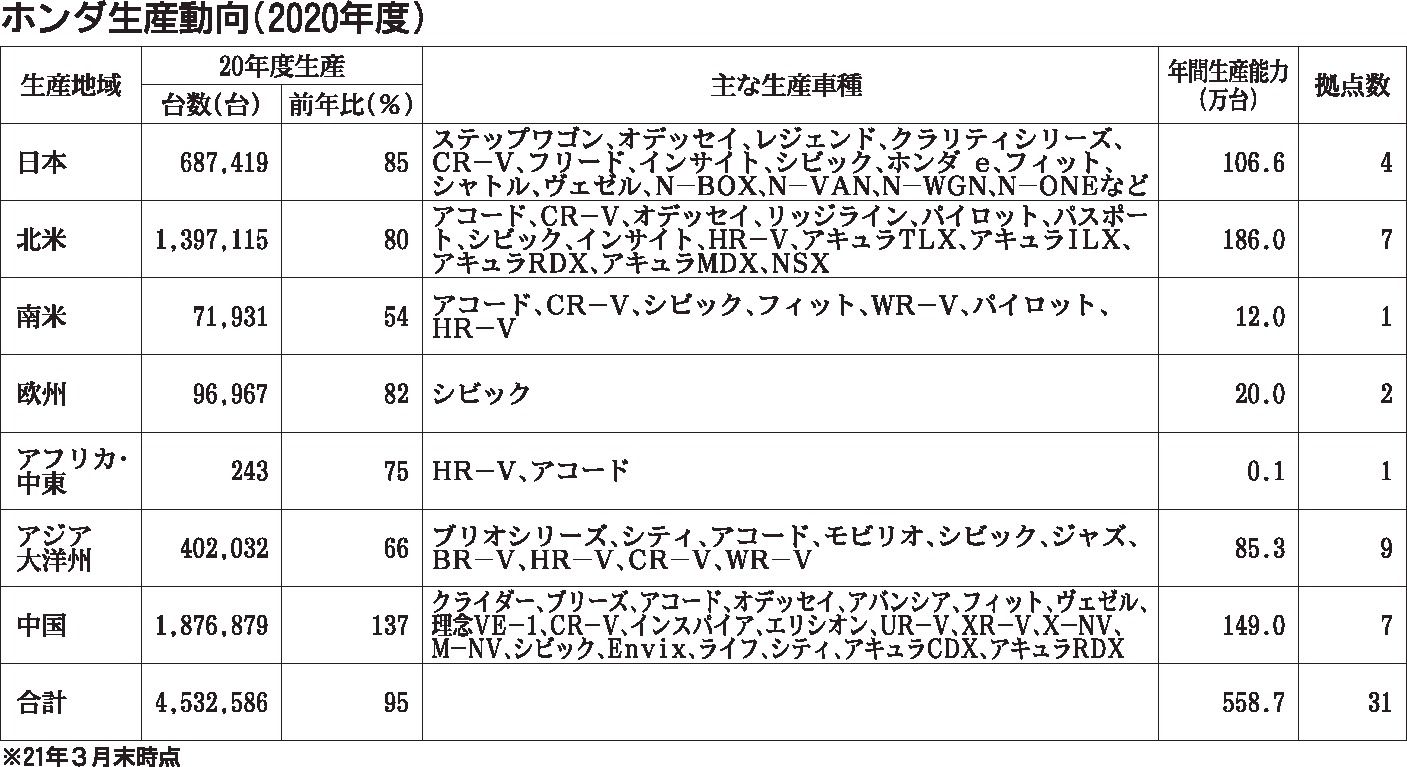 ホンダの2020年度(20年4月~21年3月)の世界生産台数は前年度比5・0%減の453万2586台だった。新型コロナウイルス感染拡大に伴う部品調達の遅れによる自動車生産への影響は軽微だったものの、半導体不足が直撃して2期連続マイナスとな...