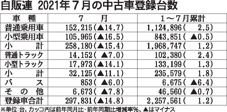 日本自動車販売協会連合会(自販連、加藤和夫会長)が12日発表した2021年7月の中古車登録台数は、前年同月比14・8%減の29万7831台の大幅減だった。前年を下回ったのは2カ月連続で、全ての車種がマイナスだった。前年同月が最初の緊急事態...