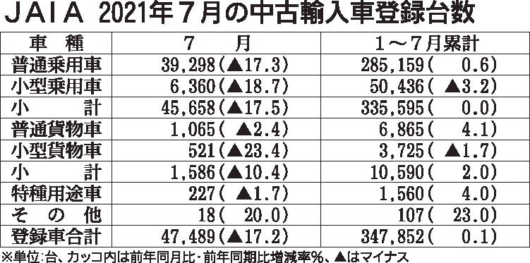 日本自動車輸入組合(JAIA、ティル・シェア理事長)が12日発表した2021年7月の中古輸入車登録台数は、前年同月比17・2%減の4万7489台となり、2カ月連続のマイナスだった。前年の大幅増からの反動が出た。一昨年の19年7月に比べても...