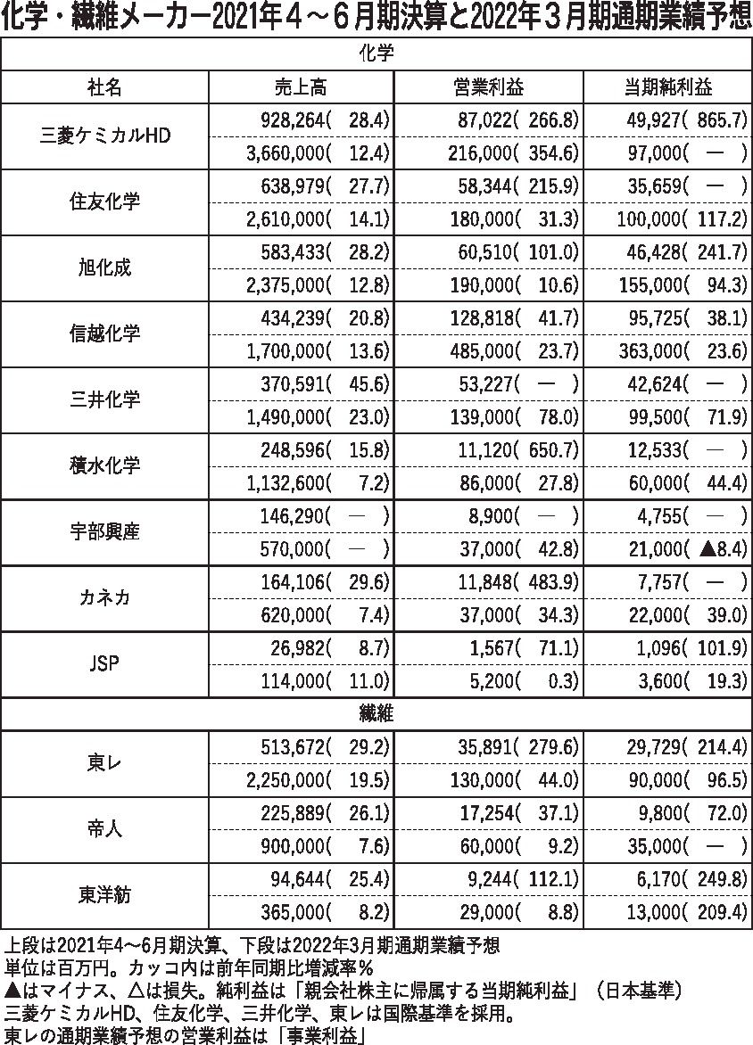 上場している主要な化学メーカー12社が発表した今期の通期業績予想によると、三井化学とJSP、東レ、東洋紡の4社が前回予想から上方修正し、帝人が売上高のみ上方修正した。三菱ケミカルホールディングスと旭化成、積水化学工業は2021年4~9月期...
