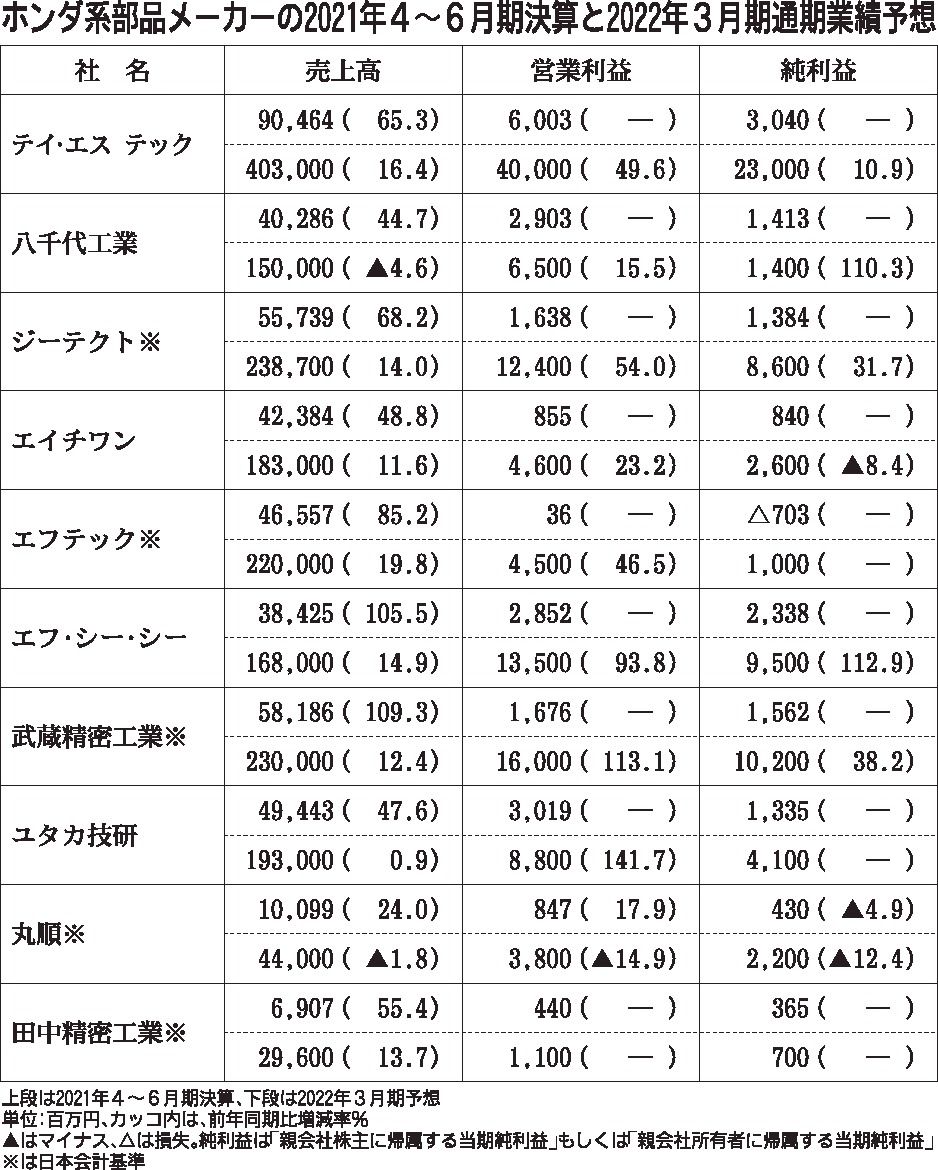 ホンダ系部品メーカー10社の2021年4~6月期決算、全社営業黒字を確保 コロナ反動増が貢献