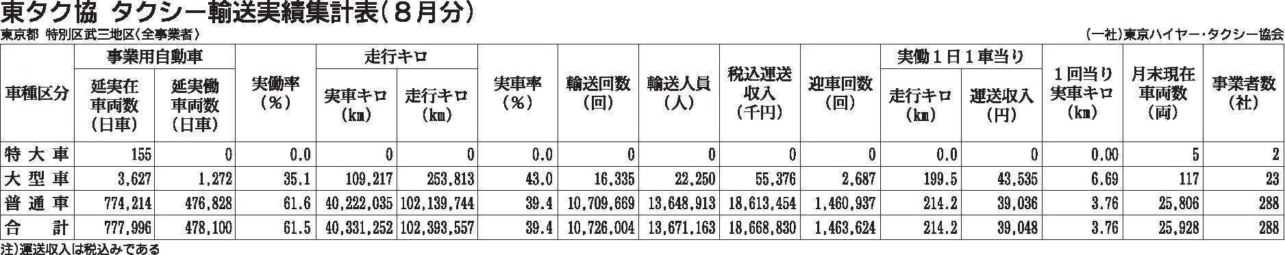 〈東タク協 タクシー輸送実績集計表(2020年8月分)〉