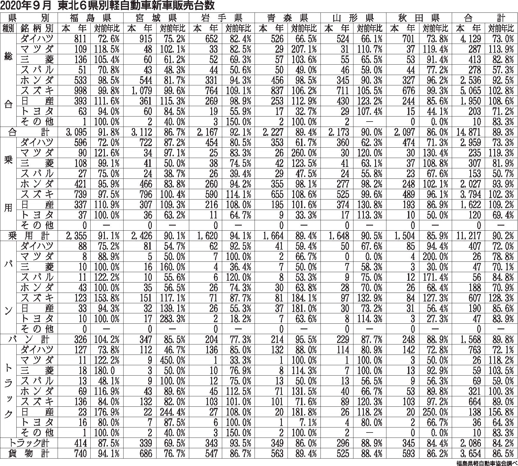 〈2020年9月 東北6県別軽自動車新車販売台数〉