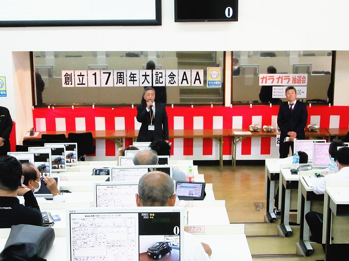 【京都】京都オートオークション(大峰高社長、KCAA京都)は21日、京都市伏見区の常設会場で年間最大規模の「創立17周年大記念オークション」を開いた。新車ディーラーとJU京都会員からの出品意欲が旺盛で、出品台数は収容能力一杯の823台、成...