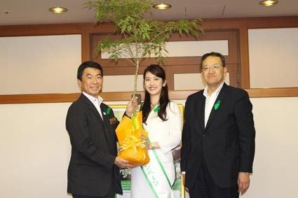 【仙台】仙台トヨペット(佐藤秀之社長)は6日、社会貢献活動の一環として「ふれあいグリーンキャンペーン」を実施し、宮城県と仙台市にアオダモやブルーベリーの苗木180本を寄贈した。佐藤社長と国土緑化推進機構「緑の大使」を務める杉本雛乃さん(2...