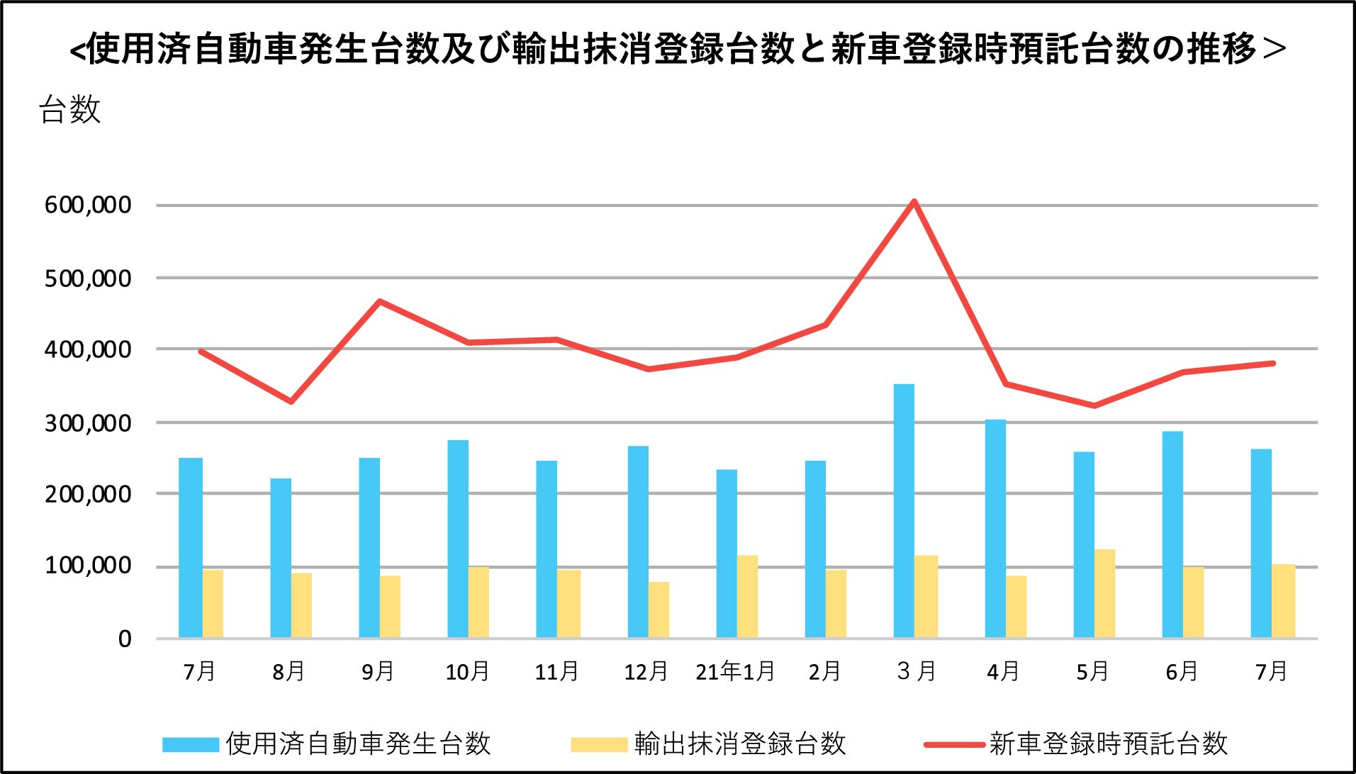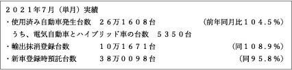 【JARCニュース】2021年7月単月の使用済み自動車は前年同月比4.5%増の26万1608台