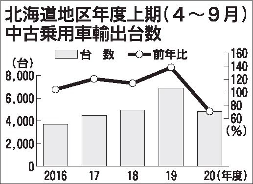 2020年度上期(4~9月)の道内中古乗用車輸出台数は、4849台で前年同期比29・4%減と大幅に落ち込んだ。新型コロナの影響で輸出が一時停滞したことが響いた。ただ、輸出の6割を占めるロシア向けは回復が早く、0・4%増の微増とした。 函館...