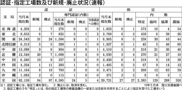 国土交通省は2015年5月末時点の認証・指定工場数および新規・廃止状況をまとめた。認証工場数は前月比3件減の9万2158件となり、3カ月連続で減少した。指定工場数は先月と同様、2万9721件で横ばいとなった。一方で専門認証工場は25件増の...