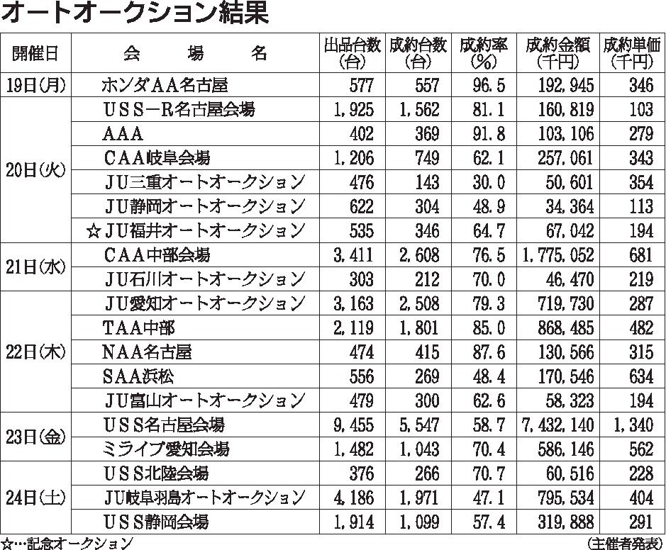 〈オートオークション結果〉中部地区 2020/10/19~24