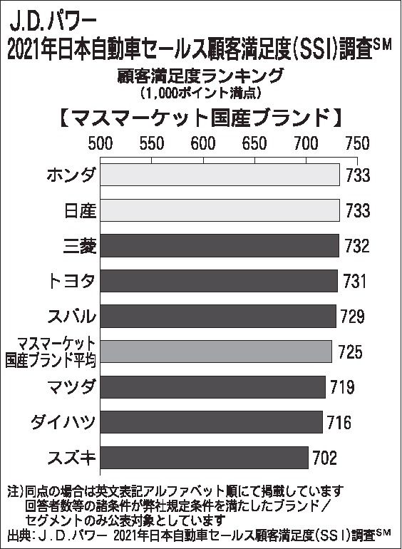 マスマーケット国産ブランド部門では、ホンダと日産が733ポイントで並んだ。ホンダは「店舗施設・サポート」で最高評価を獲得。日産は全項目で平均ポイントを上回った。3位は三菱自で732ポイント。平均は725ポイントだった。