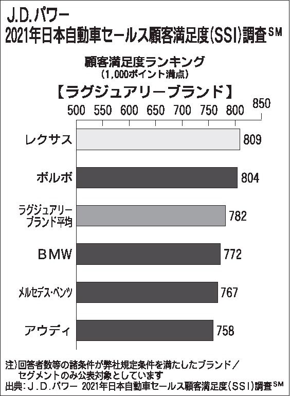 ラグジュアリーブランド部門(対象5ブランド)で最高評価だったレクサスは、「店舗施設・サポート」「商談」「契約手続き」の3項目でトップの評価を獲得。平均獲得ポイントが782ポイント(1千ポイント満点)の中、809ポイントを獲得した。2位はボルボで804ポイント。