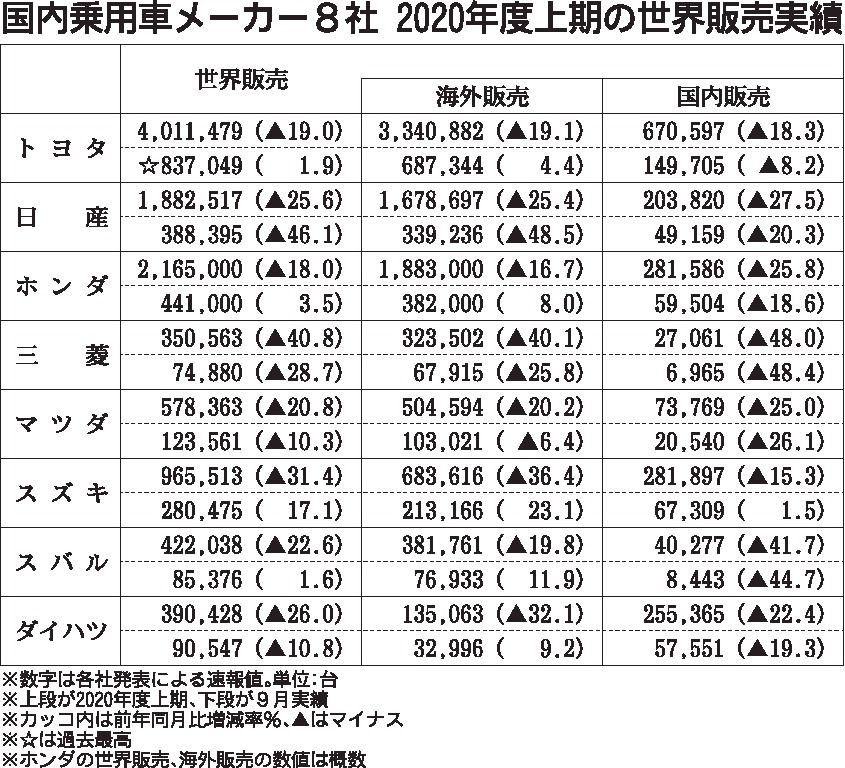 〈国内乗用車メーカー8社 2020年度上期の世界販売実績〉