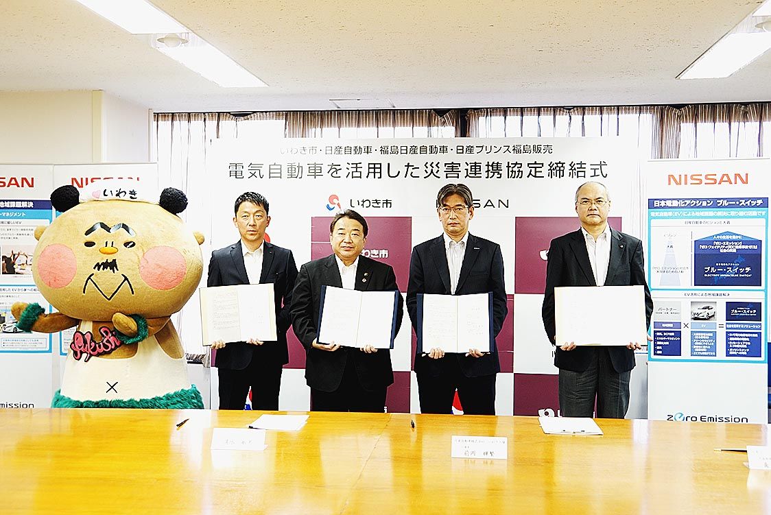 【いわき】日産自動車と福島日産(金子與志人社長)、日産プリンス福島(長島健博社長)、福島県いわき市(清水敏男市長)の4者は、電気自動車(EV)を活用した「災害連携協定」を締結した。福島県の自治体で日産グループが連携協定を結ぶのは、今回が2...