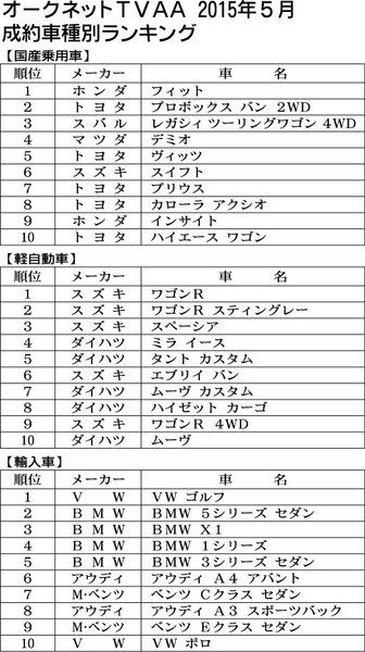 オークネット(藤崎清孝社長、東京都港区)は、5月の「オークネットTVオークション成約車種別ランキング」をまとめ発表した。国産車部門では、前月5位のホンダ「フィット」が1位に。軽自動車部門では、スズキ「ワゴンR」が3カ月連続でトップとなった...