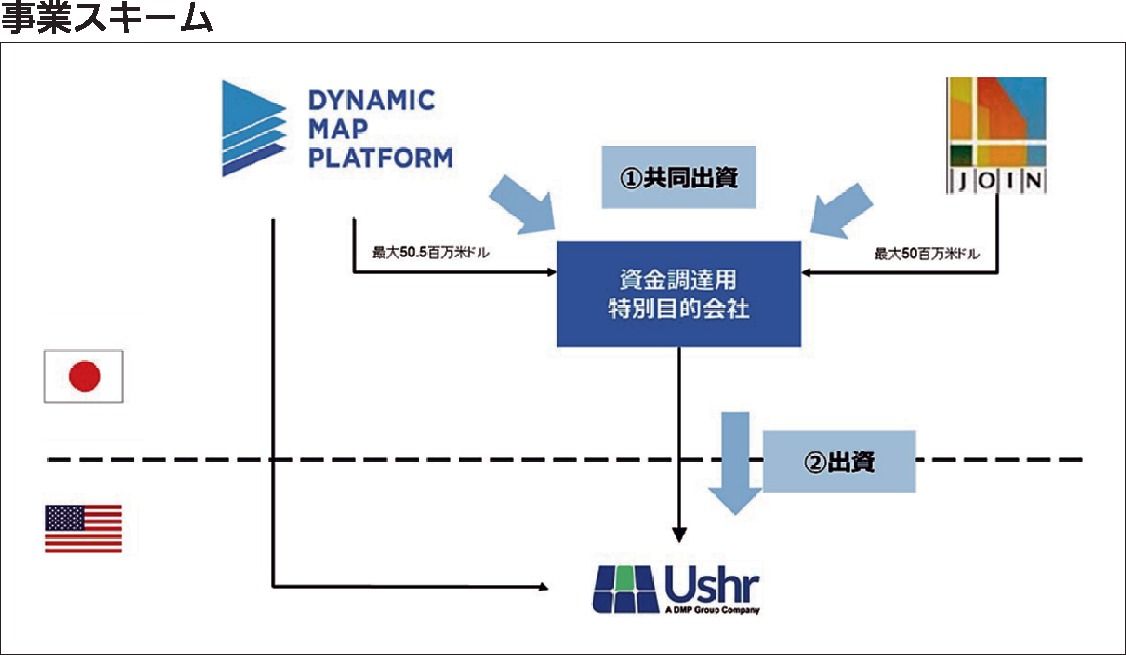 ダイナミックマップ基盤が最大5050万ドル、JOINが最大5千万ドルをそれぞれ出資する形で、共同出資会社を設立する。共同出資会社を通じてダイナミックマップ基盤の米国子会社であるUshrに対し事業資金を拠出する。
