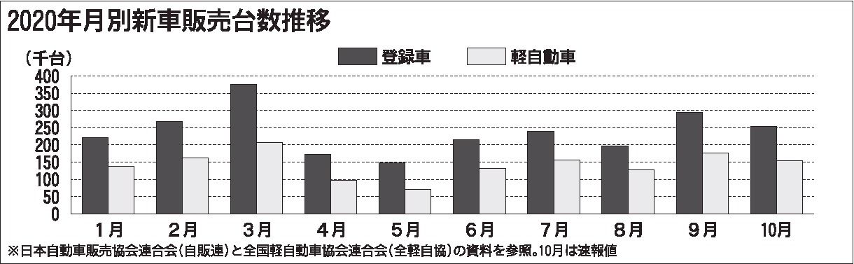 軽自動車を含む2020年(1~12月)の新車販売台数が、4年ぶりに500万台を下回ることが確実となった。11、12月を前年実績並みと想定して試算した場合、約454万台となる見通し。新型コロナウイルスの感染拡大を背景に、外出自粛要請によるデ...