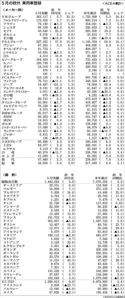 18年5月のメーカー別欧州乗用車登録 VWグループ、ルノーグループ堅調