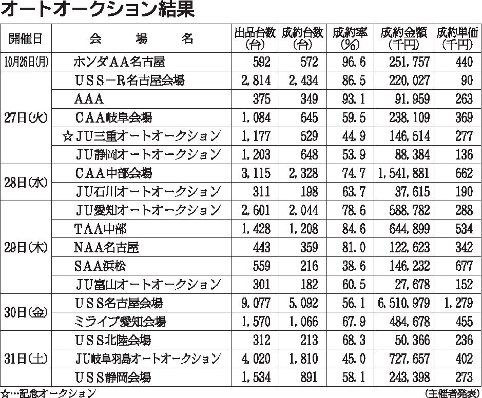 〈オートオークション結果〉中部地区 2020/10/26~31