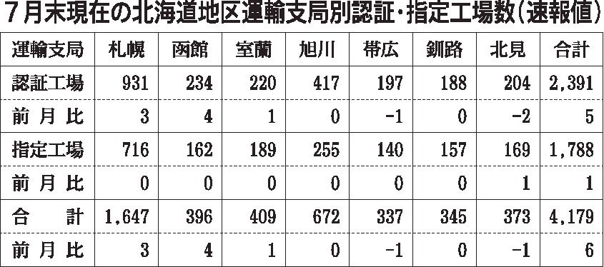 【札幌】北海道運輸局は、7月末現在の道内分解整備工場数をまとめた。それによる前月末より6増の4179工場となった。うち認証工場が同5増の2391工場で、指定工場は1増の1788工場だった。...
