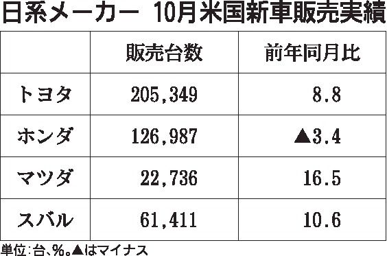 米国に進出する日本の乗用車メーカー4社の10月の米国新車販売実績は、前年同月比5・4%増の41万6483台だった。 ホンダを除く3社が前年を上回り、トヨタ自動車とスバルは10月単月として過去最高を記録した。 トヨタは同8・8%増の20万5...