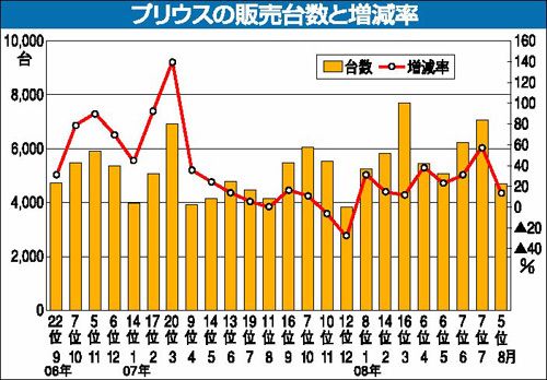 トヨタ自動車のハイブリッド車「プリウス」の販売が異常な好調さを持続している。同車は来年春のフルモデルチェンジを予定している、いわば“モデル末期”の車。にもかかわらず、8月には登録乗用車の車名別販売ランキングで過去最高タイの5位になった。9...