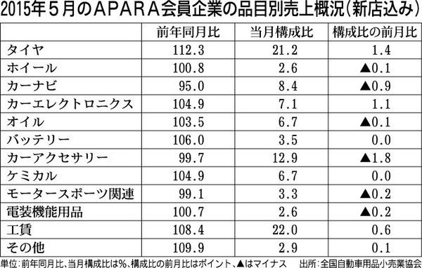 ■タイヤ、オイル、バッテリー増、カーナビ減 消費増税から1年、用品量販店では消耗必需品を中心に徐々に需要が回復している。自動車用品小売業協会(APARA、森本弘徳会長)会員企業の用品販売店における5月の売り上げ動向によると、売上高は既存店...