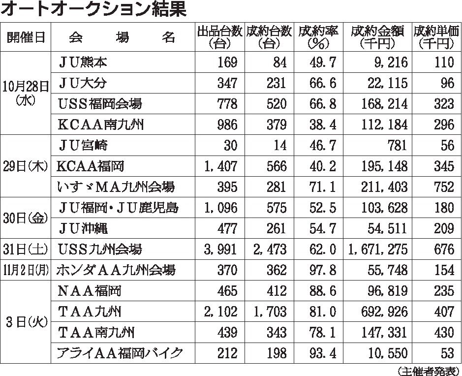 〈オートオークション結果〉九州地区 2020/10/28~11/3