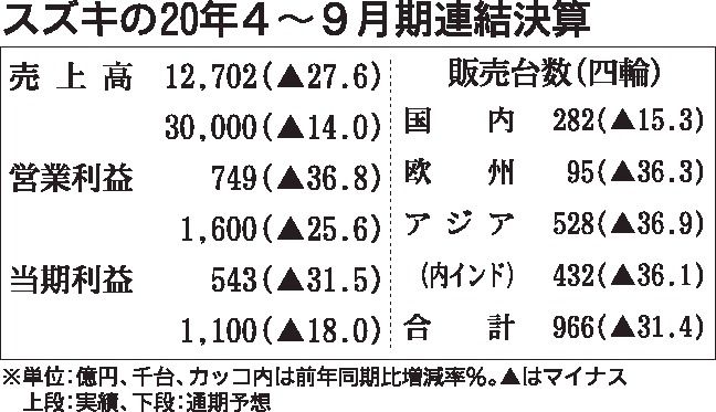 4~9月期の連結業績は、2期連続の減収減益となった。四輪車世界販売台数は、前年同期比31.4%減の96万6000台。原価低減や諸経費の減少があったものの、売上・構成変化などのマイナス要因が働いた。ただ、7~9月期は日本とインドで収益が大幅改善し、四輪車販売はインドが前年同期比19.6%増、日本は同6.0%増に回復した。
