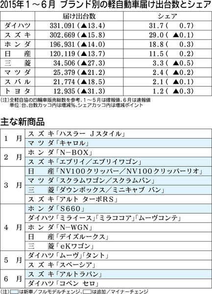 2015年上期(1~6月)の軽自動車販売は、ダイハツが07年上期以降9年連続となる首位を獲得した。ホンダと日産もシェアを伸ばした。2位のスズキは0・1ポイント減ながら、ダイハツとともに30万台を超えて、2社で総台数の約60%を占めた。軽自...