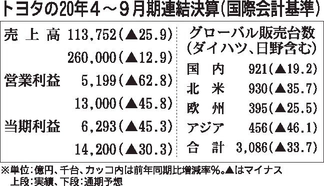 同日、発表した20年4~9月期連結業績は、売上高が11兆3752億円(前年同期比25.9%減)、営業利益が5199億円(同62.8%減)、最終利益が6293億円(同45.3%減)だった。後半の7~9月期は前年同期の8割近い5060億円の営業利益を稼いだ。