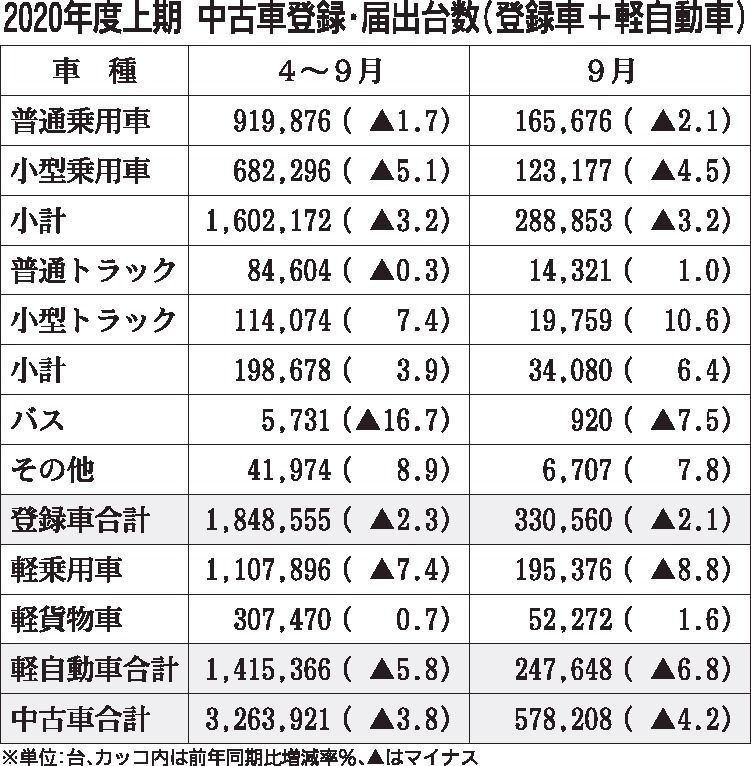 2020年度上期(4~9月)の中古車登録・届け出台数は、前年同期比3・8%減の326万3921台と6年ぶりに前年実績を下回った。新型コロナウイルス感染症拡大の影響で5月に前年同月比19・9%減と大きく落ち込んだものの、6~8月は外出自粛の...