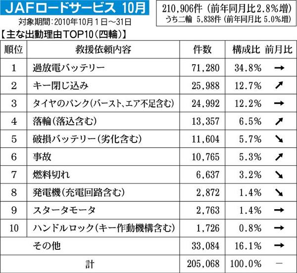 JAF 10月のロードサービス、キー閉じ込み再び2位に
