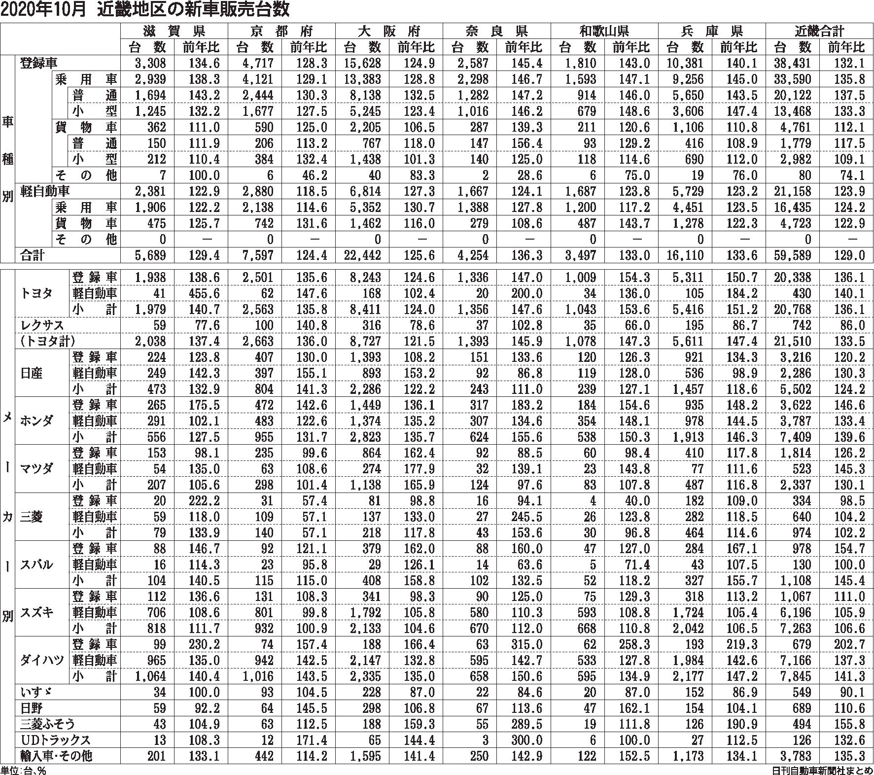 近畿2府4県の10月の新車販売台数は登録車と軽自動車の合計が前年同月比29・0%増の5万9589台で13カ月ぶりのプラスに転じた。登録車は32・1%増、軽は23・9%増で、いずれも2019年9月以来の前年超えを記録した。夏以降の受注の回復...