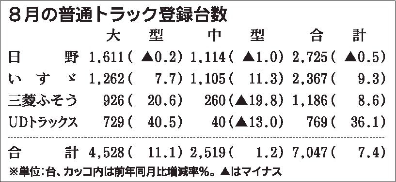 業界筋がまとめた8月の普通トラック(積載量4㌧以上)販売台数は、前年同月比7・4%増の7047台だった。前年がコロナ禍の影響などで低迷していた反動もあり、前年水準を上回った。 メーカー別ではいすゞ自動車が同9・3%増、三菱ふそうトラック・...