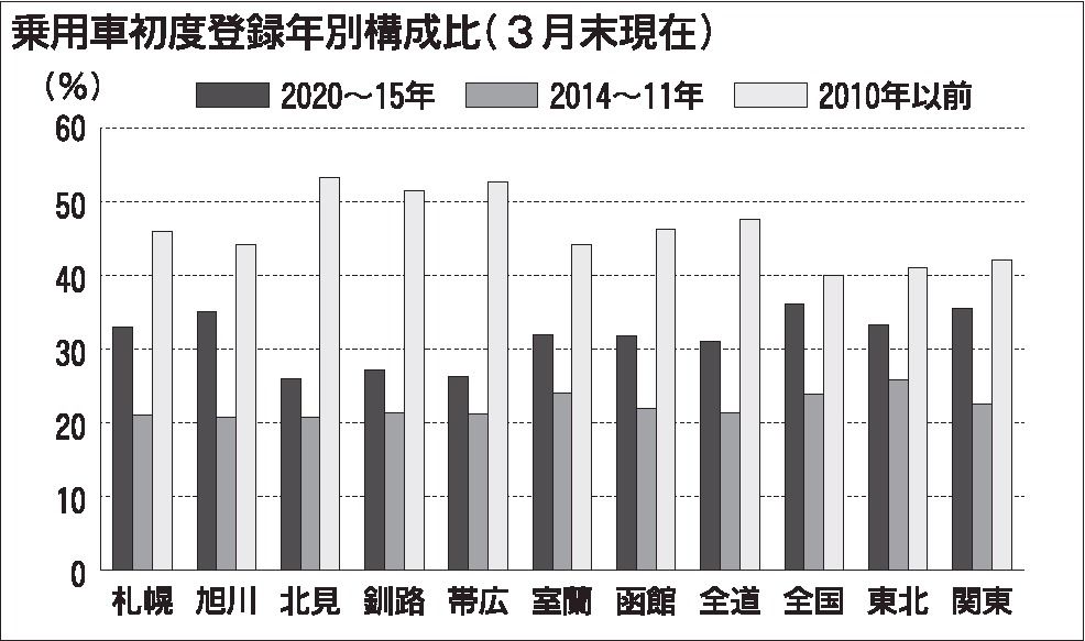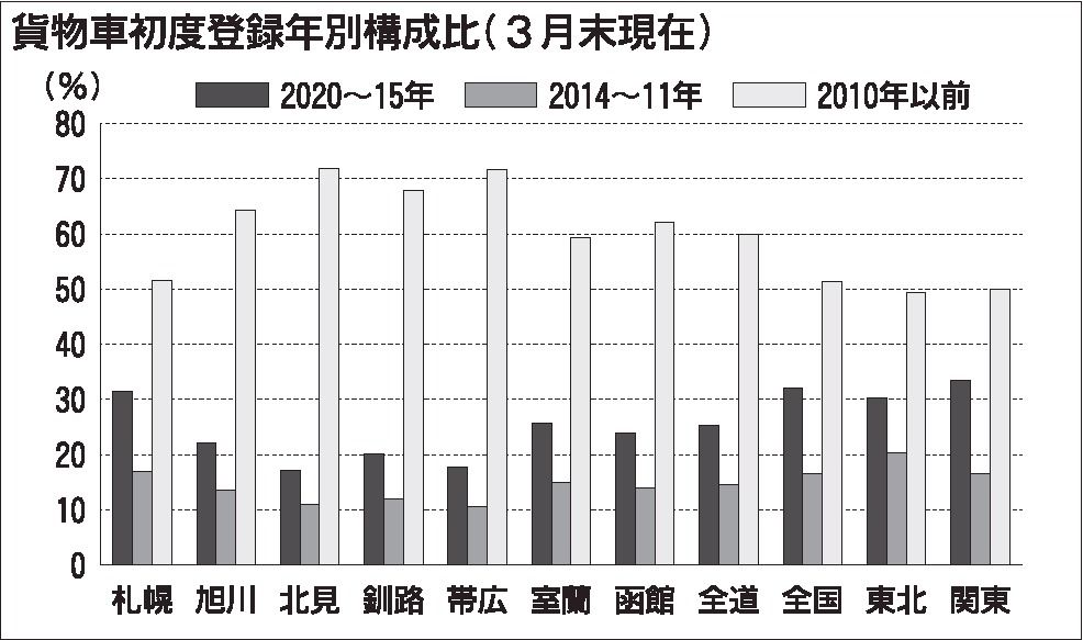 今年3月末現在で初度登録から10年以上(2010年以前)経過した北海道地区の長期使用車は、129万1千台に上る。その保有割合は51・2%で、全国平均の43・1%を大きく上回る。車種別でみると、乗用車が47・6%、物流を担う貨物車は60・0...