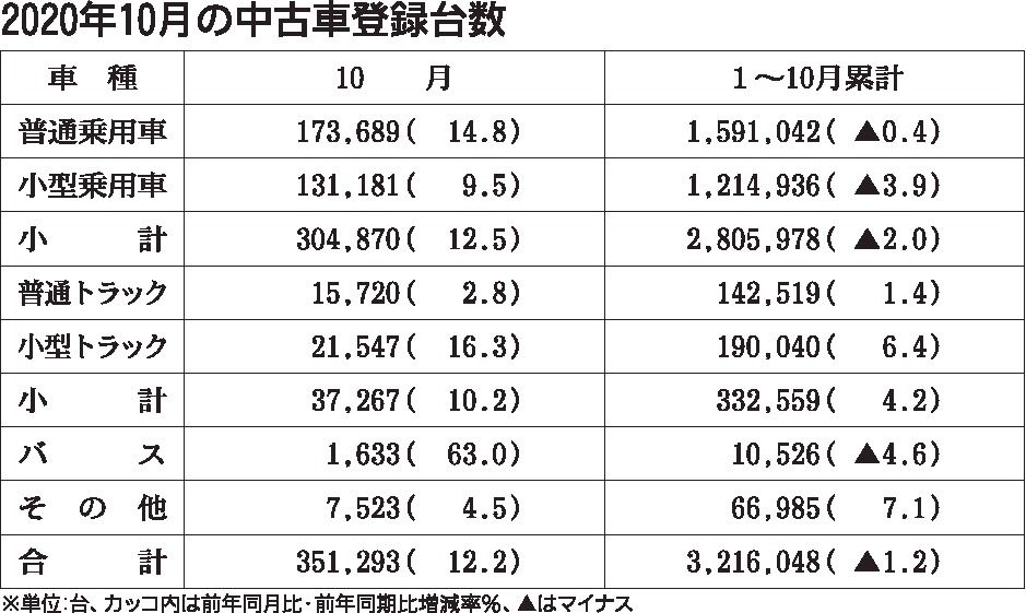 日本自動車販売協会連合会(自販連、加藤和夫会長)が12日に発表した10月の中古車登録台数は、前年同月比12・2%増の35万1293台だった。2カ月ぶりの増加。普通乗用車は統計開始以来、10月として過去最高を記録した。新型コロナウイルス感染...