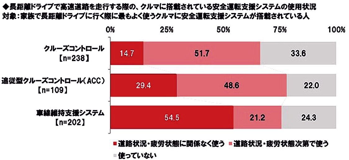高速道路を走行する際、クルーズコントロール(搭載車両を所有する238人)を「道路状況や疲労状況しだいで使う」とした回答は51.7%を占めた。対照的に、車間維持支援システムで同様の回答を示したのは21.2%だった。なお、回答者全体の56.1%は安全運転支援システムを搭載していない車両を所有していた。