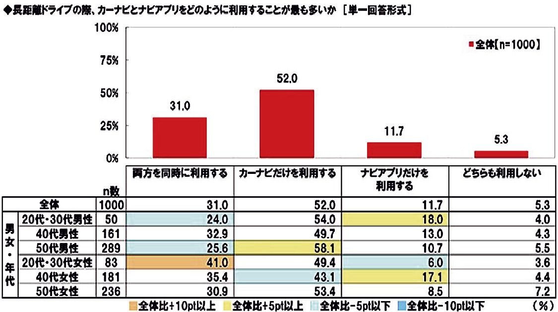 「カーナビゲーション・ナビゲーションアプリの利用実態」(単一回答)については、「カーナビゲーションだけを利用する」が52.0%、「両方を同時に利用する」が31.0%、「ナビゲーションアプリだけを利用する」が11.7%だった。男女・年齢別では、20~30歳代女性が「両方を同時に利用する」が41.0%で、「目的地や経路に関する有益な情報を入手することで、より充実した長距離ドライブを楽しんでいる」(同社)とみる。